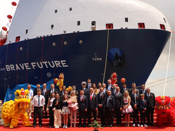 揚子三井代表宋書明先生表示:“繼今年1月“Brilliant Future”號成功交付后,我們迎來了第二艘雙燃料LEG運輸船的交付。值此機會,我們衷心感謝Braskem的Cristiane女士、Hardi先生,以及Ocean Yield的Andreas先生。感謝Hartmann集團的Hartmann博士、Adami船長、Ionut Cornea先生、龍葉飛先生,感謝AC-INOX的Sascha先生。感謝整個Hartmann團隊始終如一的支持,也感謝DNV船級的專業(yè)指導。同時,向所有參與本船建造的YAMIC員工致以誠摯謝意。未來,我們將繼續(xù)與各方緊密合作,為船東研發(fā)建造更加安全、更加綠色、更高性能的綠色能源氣體運輸船產(chǎn)品?!?/span>教母Cristiane Rego女士為新船命名并擲香檳禮,現(xiàn)場鞭炮齊鳴、禮花綻放,汽笛共鳴,龍獅共舞,祝福新船和船員航行平安,勇敢前行,為船東和租家?guī)砗眠\與財富,也為Hartmann、DNV和揚子三井贏得榮耀,帶給所有人勇氣與希望。Hartmann代表Adami Ulrich表示:“衷心感謝揚子三井團隊。揚子三井憑借嚴謹?shù)墓芾砗椭苊艿挠媱潱_保了本船的順利交付。我們對揚子三井未來的發(fā)展充滿信心,也感謝所有為此付出努力的員工?!?/span>Braskem代表Hardi Schuck表示:“正是由于揚子三井在船舶建造過程中的專業(yè)精神與奉獻,讓我們對Brave Future感到無比自豪?!?/span>