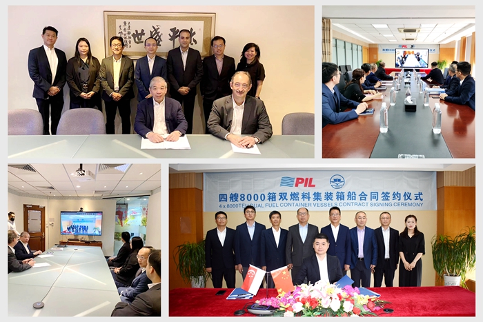 7月5日,我集團(tuán)與新加坡太平船務(wù)(PIL)簽訂了4艘8000TEU液化天然氣(LNG)動(dòng)力雙燃料集裝箱船訂單,雙方代表通過(guò)“云簽約”方式完成合同簽署。